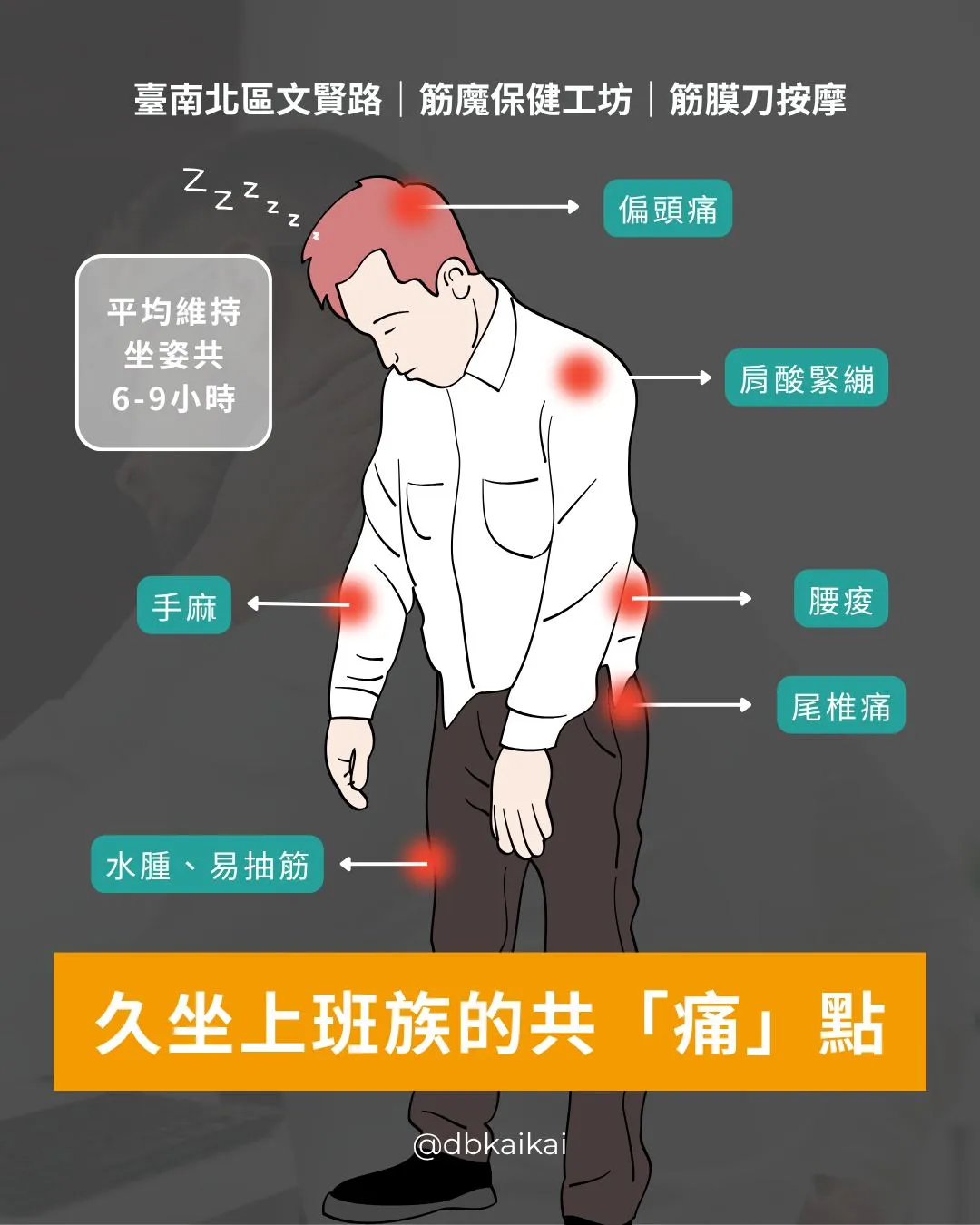 超過70%的上班族因長時間久坐感到全身痠痛 也誘發其他我們客人常說的“老毛病” 如果上面說的就是你,歡迎來筋魔體驗西式筋膜刀舒壓按摩