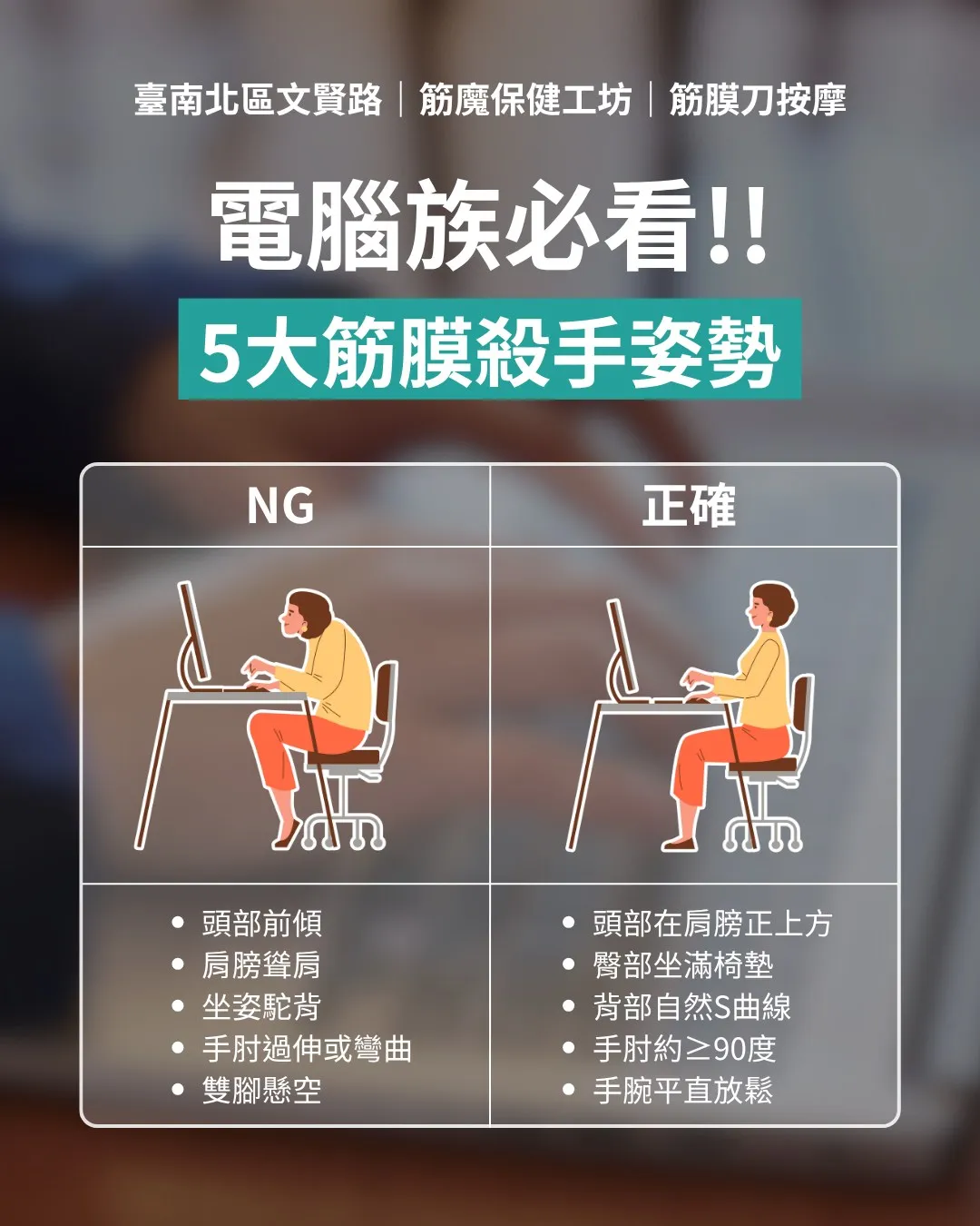 使用電腦最常犯的「筋膜殺手」姿勢,長期下來,會讓筋膜張力失衡,逐漸緊繃、沾黏,導致肩頸痠痛、腰背僵硬、甚至手麻!
