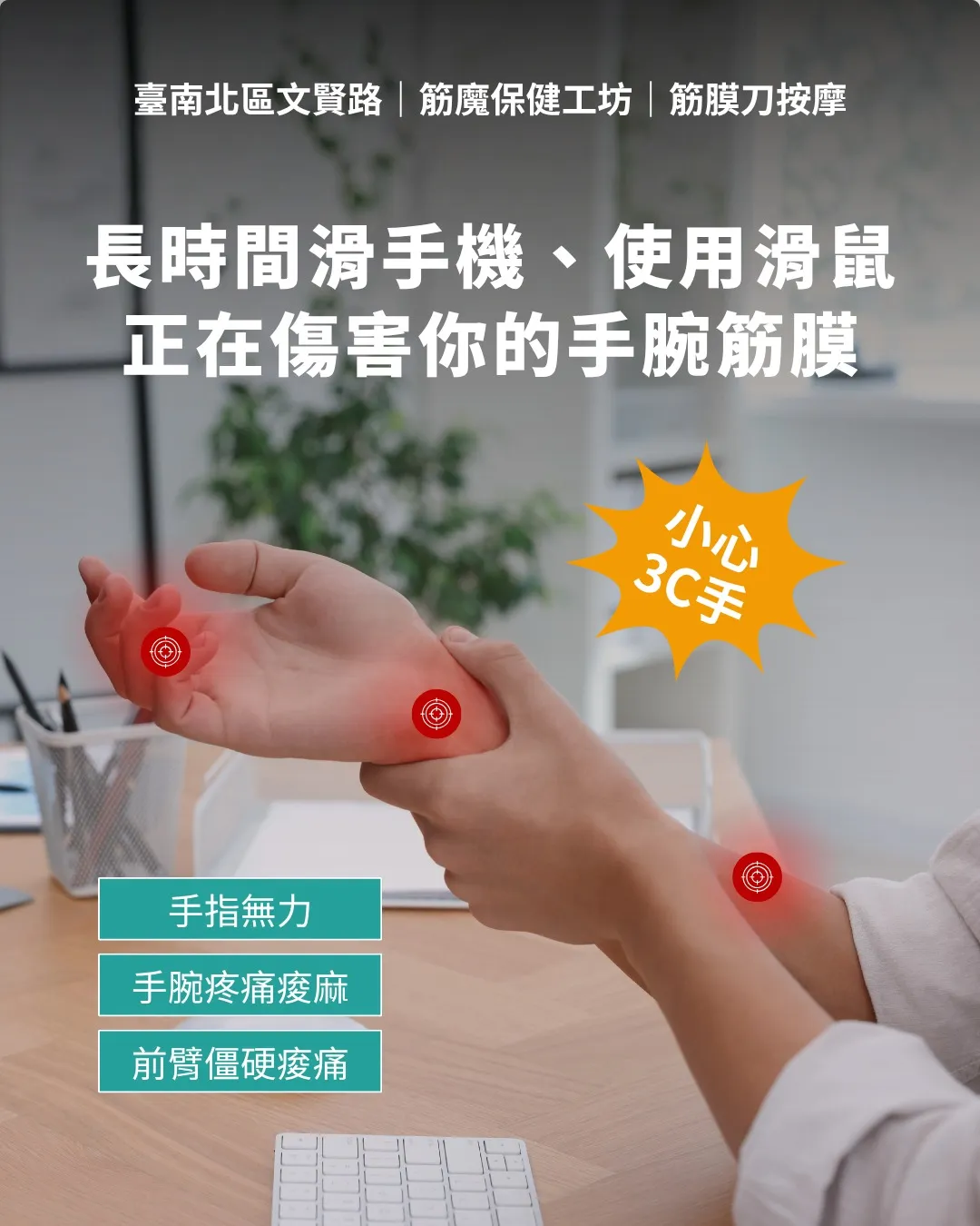 長時間滑手機、連續操作滑鼠,會讓你的手腕與手指筋膜長期被拉扯或壓迫,逐漸出現緊繃、沾黏。