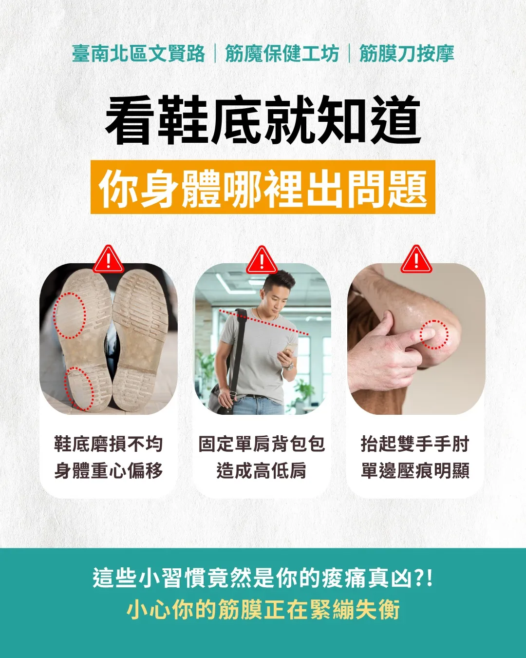 ▸脫下鞋子看看,是不是一邊磨得特別兇? ▸想想自己是不是總愛用同一邊肩膀背包包? ▸辦公室上班族抬起雙手手肘,看看哪一邊桌子壓痕最明顯?